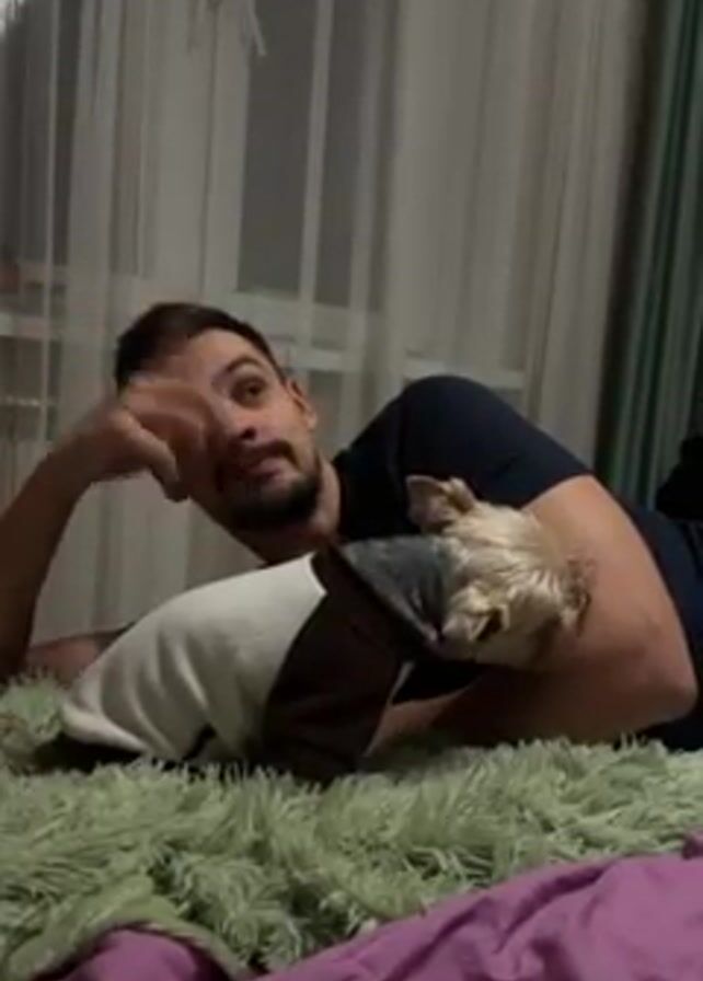 A man lies on his left side on a bed, with a small dog snuggled against his right arm. The man, who has short dark hair and a beard, is wearing a dark blue t-shirt. He props his head up with his left hand, his finger near his nose, and looks up and slightly to the left. The dog is wearing a gray and brown sweater. The bed has a pink sheet and a shaggy green blanket. A sheer white curtain hangs in front of a window in the background.