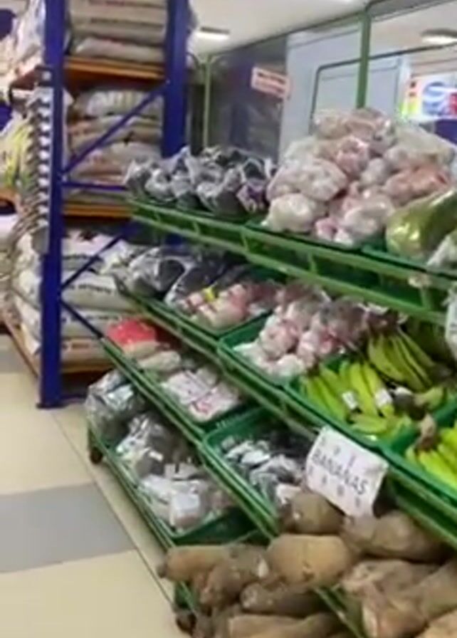 interior of a grocery store. The camera is positioned at the end of a aisle with produce on shelves to the right, and bags of rice stacked high on a blue metal shelf on the left. The produce section has items such as bananas, plantains, and yams. An employee wearing a pink shirt and jeans walks down the aisle. The back of his shirt says, "Ask me". Other customers can be seen further down the aisle.