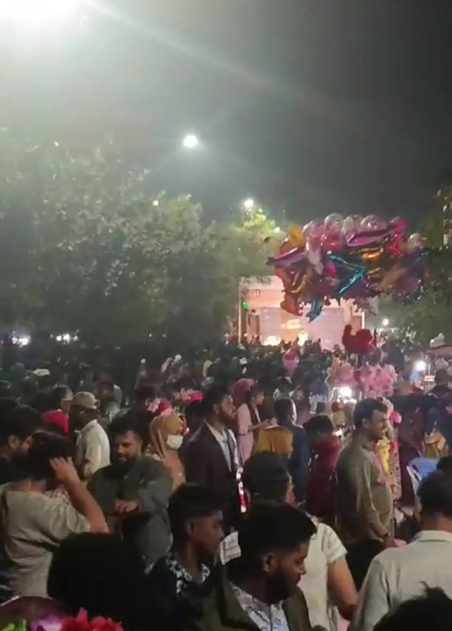 large crowd of people gathered outdoors at night, with a bright light in the upper left of the frame. Trees are visible on the left side of the frame. A cluster of balloons in various colors and shapes floats above the crowd, partially obscuring a decorated structure in the background. Many individuals are seen moving and interacting within the crowd, with some people wearing masks or head coverings. The scene appears to be lively and festive. The camera moves through the crowd, focusing on different people and details.