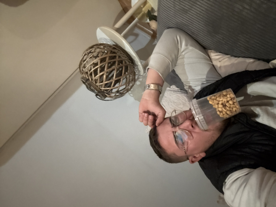 An indoor scene in the city of Haskovo, Bulgaria, depicts a male subject reclining on a grey, ribbed sofa against light-colored cushions. The male, with short dark hair and gold-framed glasses, wears a dark sleeveless vest over a light-colored long-sleeve shirt, and a silver-toned wristwatch on his left wrist. He holds a clear plastic container filled with roasted chickpeas near his mouth, while his left hand rests on his forehead. His eyes are partially closed. The immediate background features a plain light-colored wall and, to the right, a decorative, woven spherical object resting on a small, light-colored round table with wooden legs.