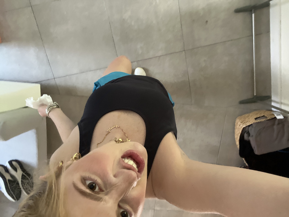 A woman in a black top and blue shorts poses for a selfie in what appears to be a bathroom. She is angled downward, showing her face close to the camera with a slight grimace. Her blonde hair is pulled back, and she is wearing jewelry. In the background, gray tiled floors are visible, along with a white couch or cabinet, a pair of sneakers, and a hamper filled with clothing. A mop or similar cleaning tool leans against the wall. The woman holds a crumpled tissue in one hand.