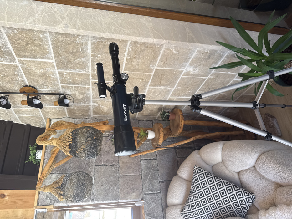 The image displays an indoor scene, likely a lounge or living area. The precise location within Virak, Montenegro, is not discernible. A black "Discovery" brand telescope is centrally positioned, mounted on a silver tripod, resting on a wooden floor. To the left, a cream-colored, textured armchair is partially visible, featuring a black and white geometric-patterned cushion. The background consists of a wall constructed from light-colored, rough-hewn stone blocks. Against this wall, a decorative wooden structure, resembling intertwining branches, supports two small, circular wooden shelves. The upper shelf holds a white pot containing a green plant, while the lower shelf displays a brown pot with a green plant. Suspended from the wooden structure are two spherical, dark woven light fixtures, secured by thick coiled rope. Vertically mounted on the stone wall, above the telescope, is a black bar supporting three individual black metal cage-style lights with wooden accents. A window with a light-colored blind is visible on the far left, providing ambient illumination. A large potted green plant with long, pointed leaves stands on the floor to the right of the tripod. A reflective surface or mirror in a dark frame is partially visible on the extreme right. No individuals, actions, or interactions are present.