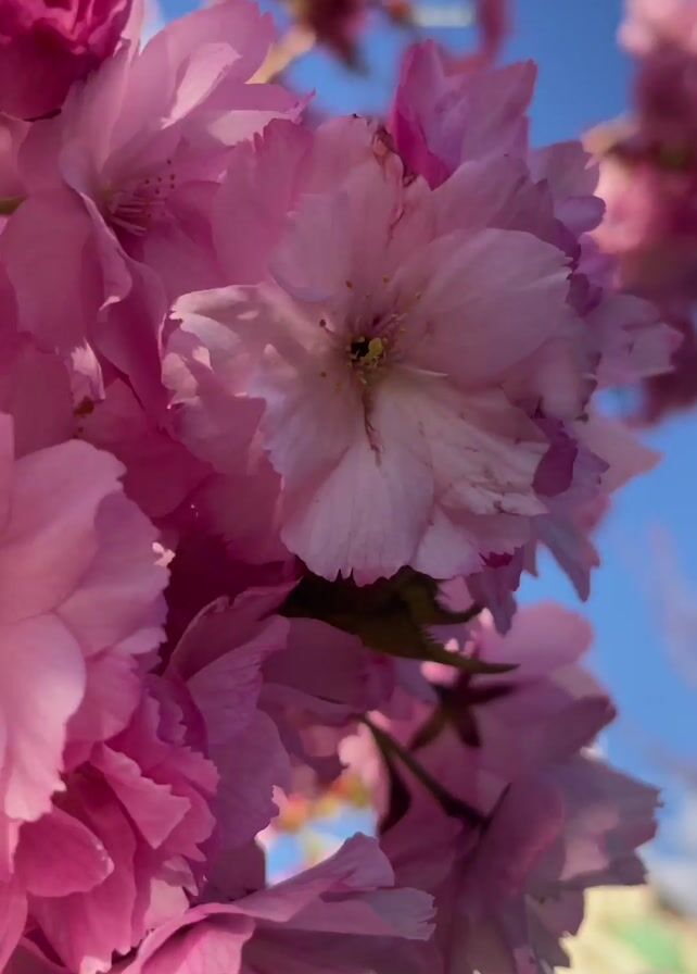 The camera looks up into a blossoming tree with pink flowers, with a blue sky in the background