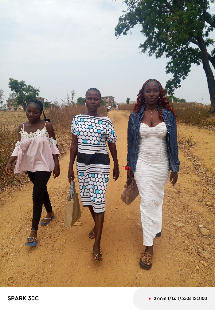Three adult females are walking towards the observer on a reddish-brown dirt path in Akwanga, Nigeria. The path is bordered by dry, sparse brown vegetation, with a large green-leafed tree on the right and several smaller trees and distant, light-colored buildings visible in the background under an overcast sky. The leftmost female has dark skin and dark hair, wearing a light pink off-the-shoulder top with white lace trim, black pants, and blue flip-flops with a silver-colored chain embellishment. Her head is angled slightly down and to her right. The central female has dark skin and short dark hair, looking directly at the camera. She wears a knee-length dress with a white top and bottom section featuring light blue and black polka dots, separated by horizontal black and white stripes. She holds a light brown paper bag in her left hand and wears gold-colored flip-flops. The rightmost female has dark skin and long, reddish-brown curly hair, looking directly at the camera. She is dressed in a white, form-fitting, textured midi-dress, a blue denim jacket draped over her shoulders, and leopard-print platform sandals. She wears a gold-colored necklace with a pendant and carries a small, light brown, soft-textured handbag in her right hand. A small red object is attached near the left lapel of her denim jacket. All three individuals are in a walking posture, occupying the width of the dirt path, indicating collective movement.