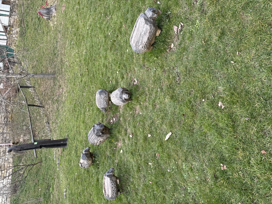 The scene depicts a gently sloping grassy area in Veliko Tarnovo, Bulgaria, under ambient daylight conditions. Six weathered log sculptures, each resembling a stylized sheep or ram with carved features and short legs, are arranged across the green and brown grass. The sculptures vary in size and orientation, with one in the lower right facing left, one in the lower center facing forward, one in the mid-left facing right, one in the upper-left facing right, one in the mid-center facing left, and another in the mid-right facing left. In the upper-left quadrant, a tall, dark, slender wooden sculpture, possibly an abstract humanoid figure, stands upright, displaying a small green rectangular marker. A dark wooden fence or railing with two horizontal bars traverses the mid-background, running across a steeper grassy incline. This incline is populated by bare deciduous trees and sparse brown vegetation. A stone retaining wall is visible in the upper-left background. To the far right background, a tree stump adorned with red fabric or material is present, with glimpses of a white fence and a building behind it. No human figures or active interactions are observed.