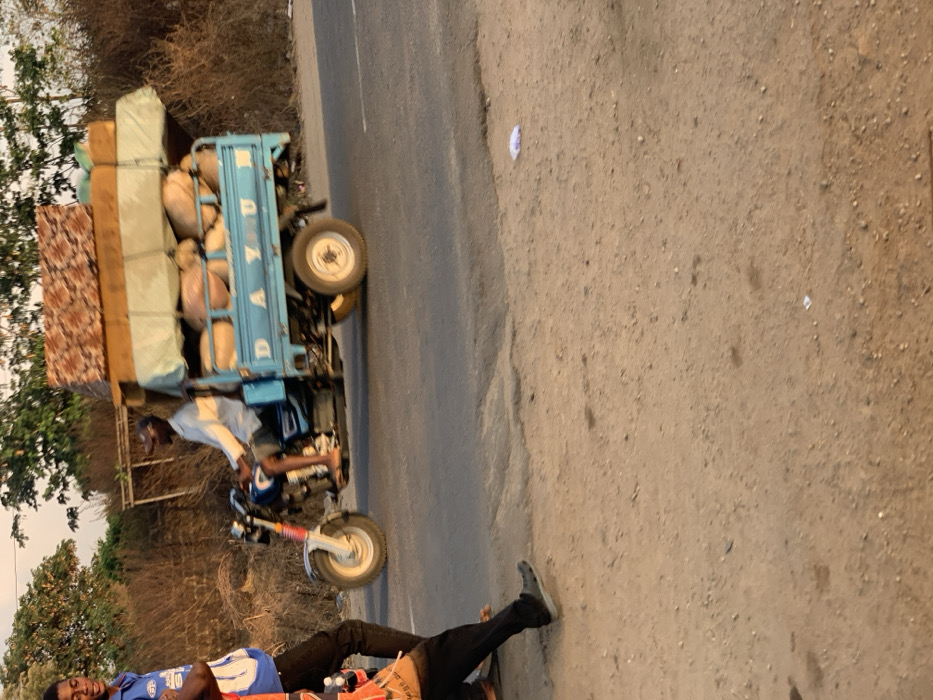 A blue three-wheeled motorcycle truck is packed with goods, including mattresses and sacks. A man sits on the motorcycle, while another man is partially visible in the foreground. The vehicle is positioned on a road with a dirt shoulder. Dry vegetation is seen on the left side of the image.