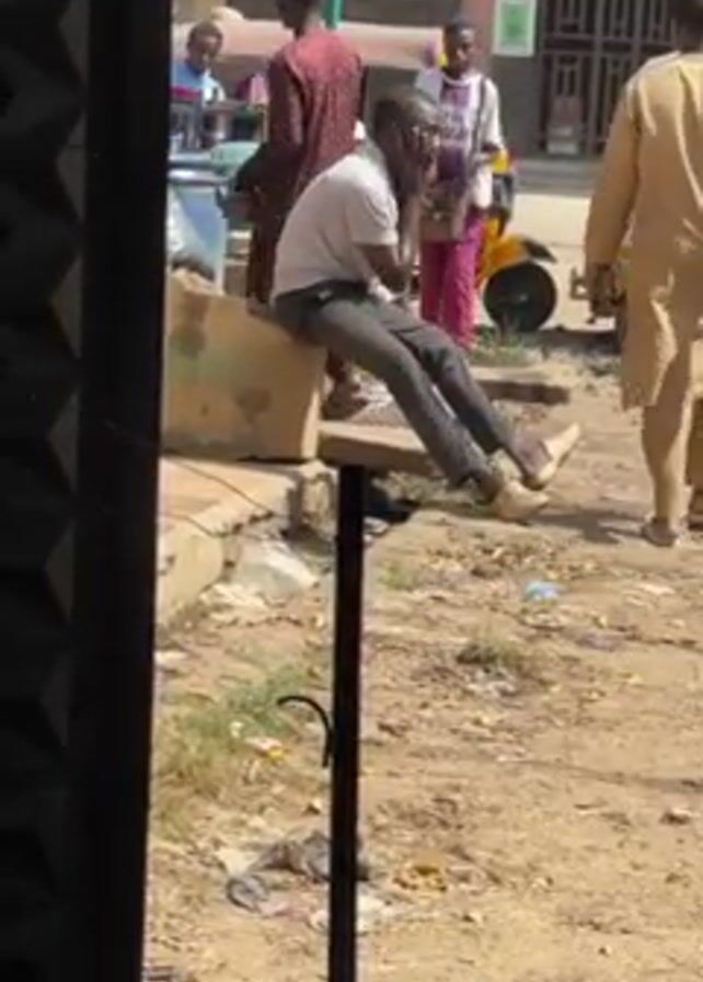 man sitting on a cement block, head in hands, seemingly distressed. He is wearing a light-colored shirt and dark pants with tan shoes. The setting appears to be an outdoor public area with a dirt ground. In the background, there are people walking, a small motorized vehicle, and buildings. One man walks by wearing a long white robe and a small patterned cap. The view of the scene is partially obstructed by what looks like a dark gate or doorway in the foreground.