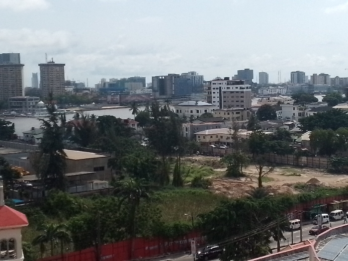 This image presents an elevated, wide-angle view of Falomo, Nigeria, under a cloudy sky