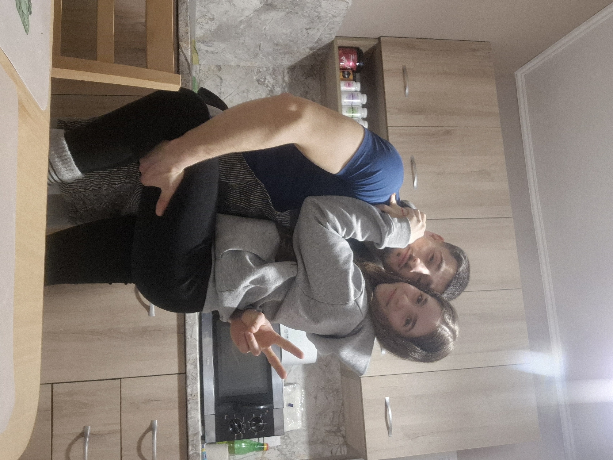 A photo shows a man and a woman in a kitchen. The woman, facing the camera, makes a peace sign. She wears a gray hooded sweatshirt. The man, in a blue t-shirt, embraces her from behind. Kitchen cabinets and a microwave oven are visible in the background. A partial view of a table and chairs are visible in the lower-left of the image. Bottles are inside an upper cabinet. The specific location of this image in the city of Pavlikeni, Bulgaria, cannot be determined from this image.