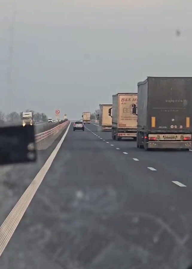 view from inside a car driving on a multi-lane highway. The sky is overcast. In the distance, several large trucks are driving in the same direction. A smaller car is also visible on the same lane, further ahead. The road has white lane markings. A guardrail is visible on the left side of the road. Some signs can be seen in the distance. The car's dashboard is partially visible at the bottom of the frame.