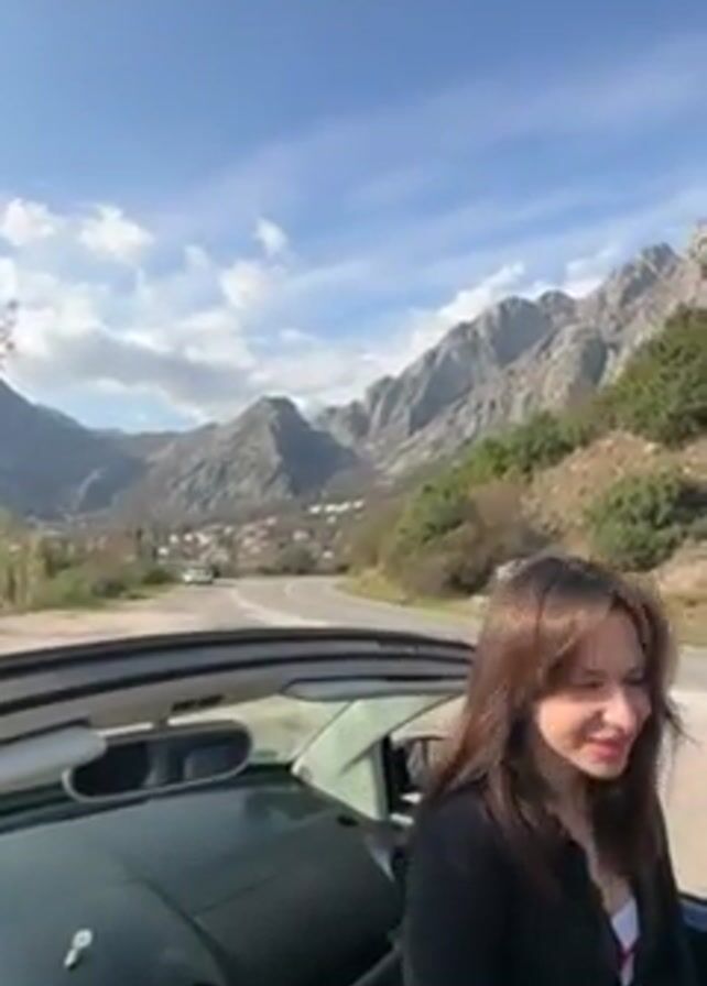 The video begins with a woman standing next to a convertible car. She is wearing a black jacket, and behind her is a mountain range, a winding road, and a town. The camera then shifts to focus on the mountains, which are rocky and sparsely covered with trees. The sky is blue with some clouds.