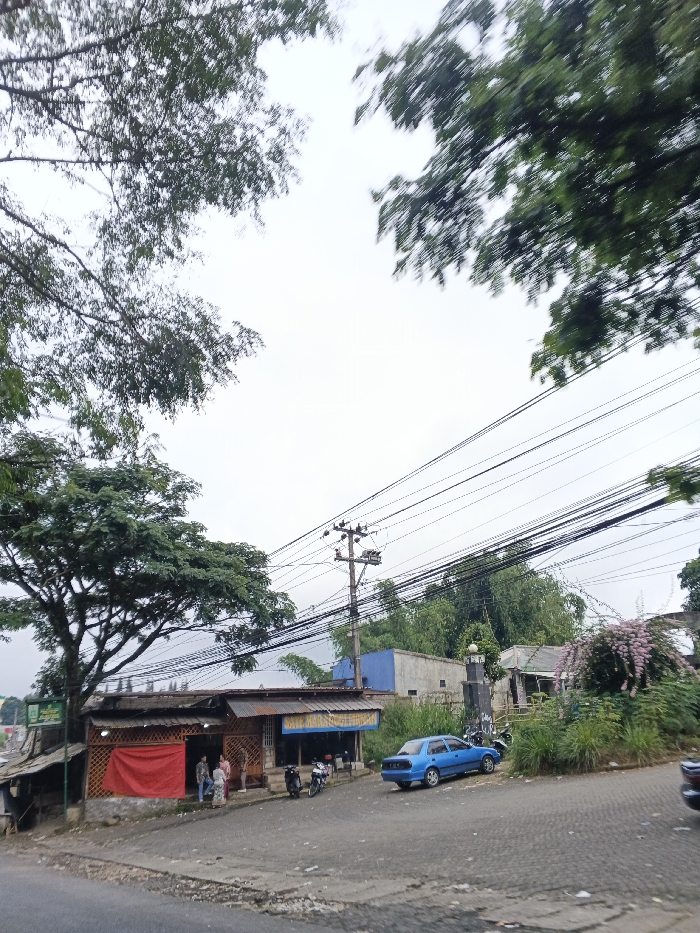This image depicts a street scene in Bhimad, Nepal, under an overcast sky. In the foreground, an asphalt road with visible cracks and debris curves slightly to the right, leading to a paved area. To the left of the paved area stands a rustic, single-story building, possibly a shop or eatery, constructed with a corrugated metal roof and walls that appear to be a mix of wood or bamboo, partially covered by a red tarp on its left facade. Approximately five individuals are visible standing near the entrance of this building, engaged in casual interaction. Two motorcycles are parked in front of this structure. Adjacent to the building, on the paved area, a blue sedan is parked facing left. A prominent utility pole, laden with numerous overhead electrical and communication lines, stands centrally behind the blue sedan and to the right of the main building. Behind this utility infrastructure, dense green foliage and trees are visible, with additional buildings, one partially painted blue, further in the background. To the far right, a section of another vehicle is visible, and a flowering bush with purple blooms grows near a dark gate post. Large trees with dense green canopies frame the upper left and right portions of the image.