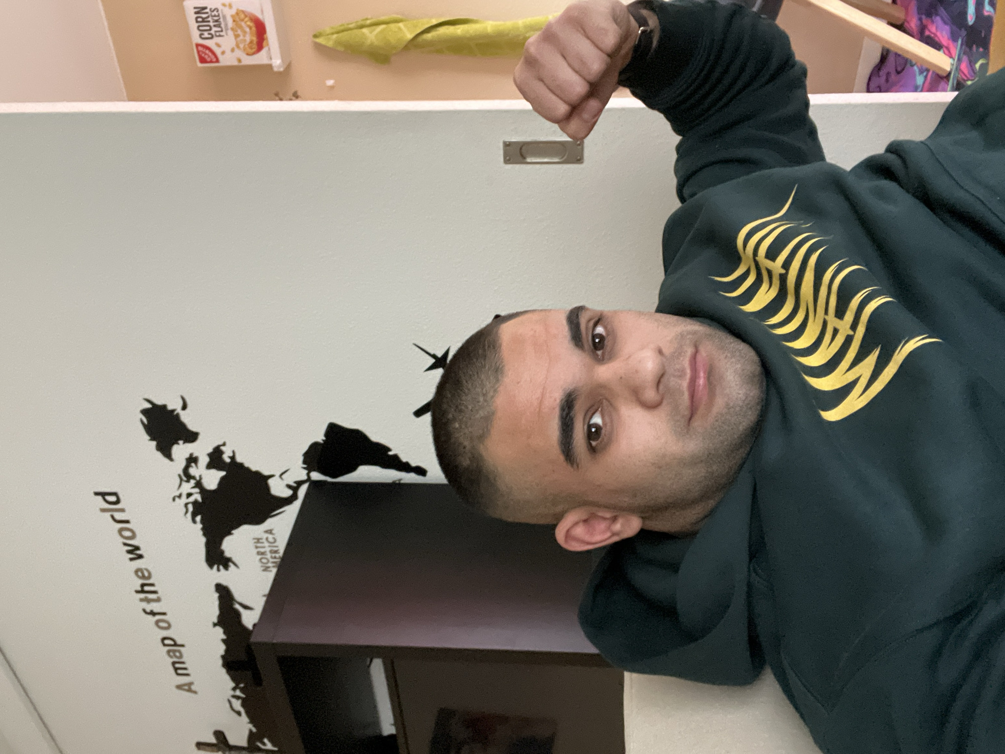 An adult male with a close-cropped haircut and light facial stubble is seated, facing the camera directly, in an indoor setting located in Basel, Switzerland. He is wearing a dark green hooded sweatshirt with a prominent yellow, stylized graphic design on the right sleeve and chest. His left hand, adorned with a dark wristband, is clenched into a fist and raised to his shoulder. The background features a light-colored wall decorated with a large black decal of the world map, surmounted by the text "A map of the world." "NORTH AMERICA" is distinctly visible on the corresponding continent decal. A dark brown cabinet is partially visible to the viewer's left. To the right of the subject, a light-colored recessed rectangular handle is mounted on the wall. A doorframe or wall partition separates this wall from an adjacent section, which is painted a light orange color. This section displays a white shelf holding a red and white "CORN FLAKES" cereal box, with a patterned yellow-green towel hanging below it. A colorful patterned floor mat and a light-colored wooden chair leg are visible in the lower right corner of the frame.