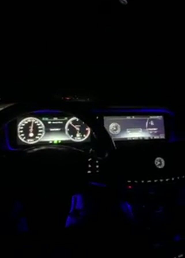 The camera is in the driver’s seat of a car at night. The dashboard and displays are lit up, and blue lights glow throughout the interior. The driver’s hands are visible on the steering wheel. The car appears to be stationary and the hazard lights are on. The radio is playing music.