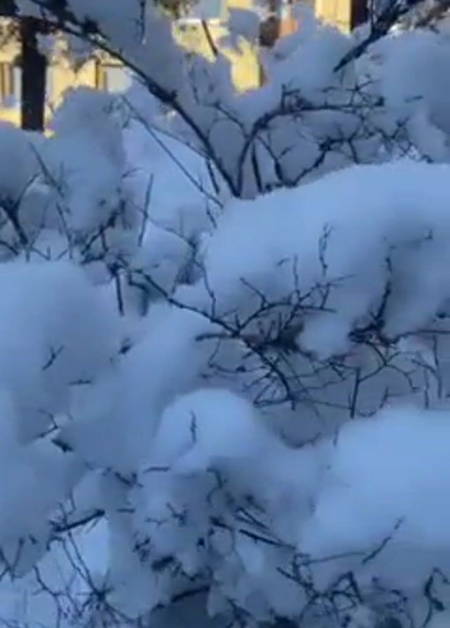 The camera focuses on a bush covered in a thick layer of snow. The branches are visible beneath the snow, and a multi-story building is visible in the background. The sky is partly visible and appears to be blue. The scene is likely outdoors during the winter.