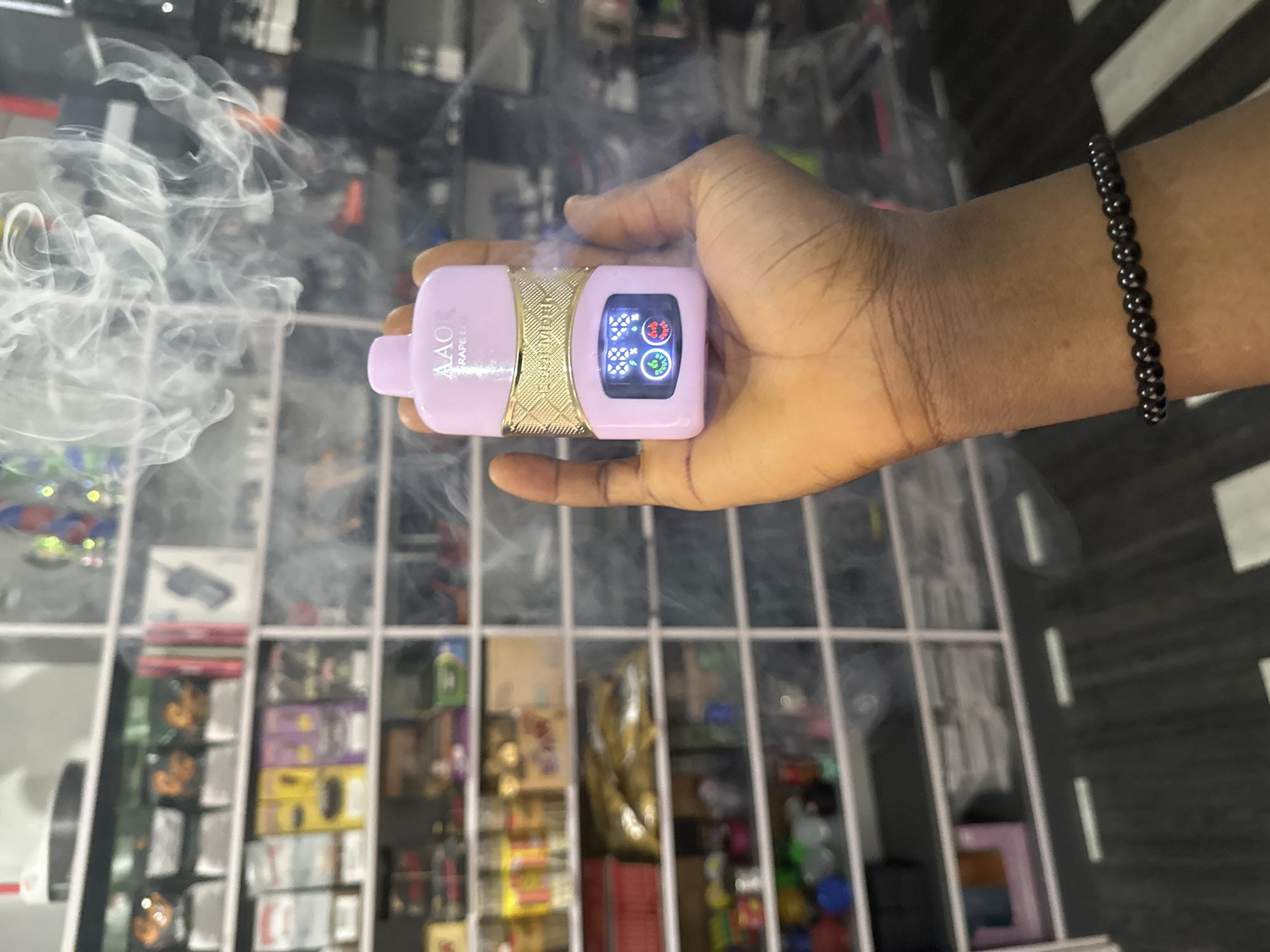 - "A dark-skinned individual's right hand holds a pink AAOK-branded disposable vape device, featuring "GRAPE ICE" text and an "EVOLVEMARK" gold-colored band" by FM-UL3Xh1, licensed under CC BY 4.0