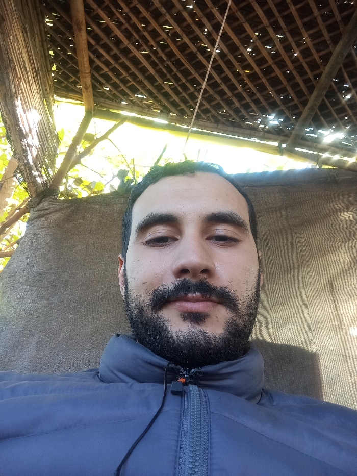 male individual, approximately 20-40 years of age, with dark hair, dark eyes, and a full dark beard and mustache. He is looking directly at the camera. He is wearing a dark blue-grey puffer jacket with a central zipper and collar, and black wired earphones are visible around his neck. The background features a wooden lattice or trellis ceiling structure composed of thin wooden beams arranged diagonally, allowing sunlight to filter through. To the left, green foliage is visible alongside a textured, light-colored fabric or woven material. To the right, a similar textured, light brown material forms a vertical backdrop. The scene is illuminated by natural light. The location is Majjate, Morocco.