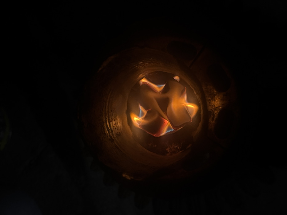 This image, captured in At-Tall, Syria, depicts a top-down, close-up view of a circular, dark-colored container, likely a shisha (hookah) bowl or a small brazier, shown against a predominantly black background. The interior of the container is illuminated by multiple pieces of burning coal, exhibiting bright orange and blue flames. The coals are arranged centrally within the container. The inner surface of the container appears textured and somewhat reflective, with hues ranging from dark orange to brown, indicating heat exposure and possibly residue. No people or external objects are visible within the frame, emphasizing the intense light source from the burning coals. The overall environment is dark, suggesting either a nighttime setting or a dimly lit interior space.