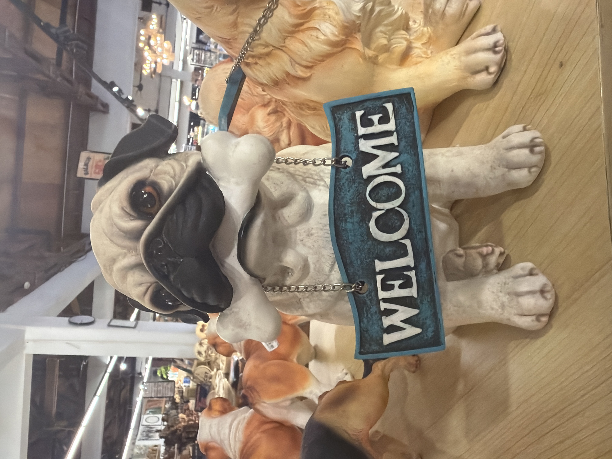 The image captures a collection of ceramic dog figurines, with a pug front and center. The pug statue holds a bone in its mouth, attached by a chain to a blue "WELCOME" sign hanging around its neck. Other ceramic dogs, including a golden retriever-like figure, are visible in the background. The scene is set within a shop, indicated by the rows of merchandise and shelving visible in the background. While the location in Nusa Dua, Indonesia is specified, no location specifics are provided in the image itself.