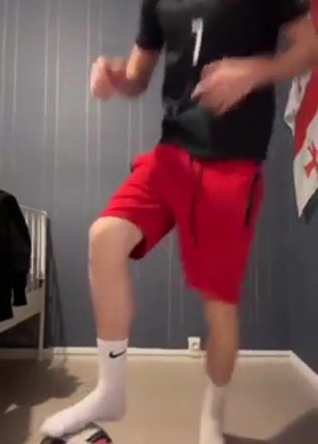 A young man wearing a black t-shirt with a white number 7 on it, red shorts, and white socks is juggling a soccer ball. He’s standing in a room with light-colored wood floors and gray vertically striped walls. A partially visible white crib is on the left side of the frame, and a Georgian flag is visible on the right wall. The man is focused on keeping the ball in the air, using his feet and knees to juggle it. Background music is playing.