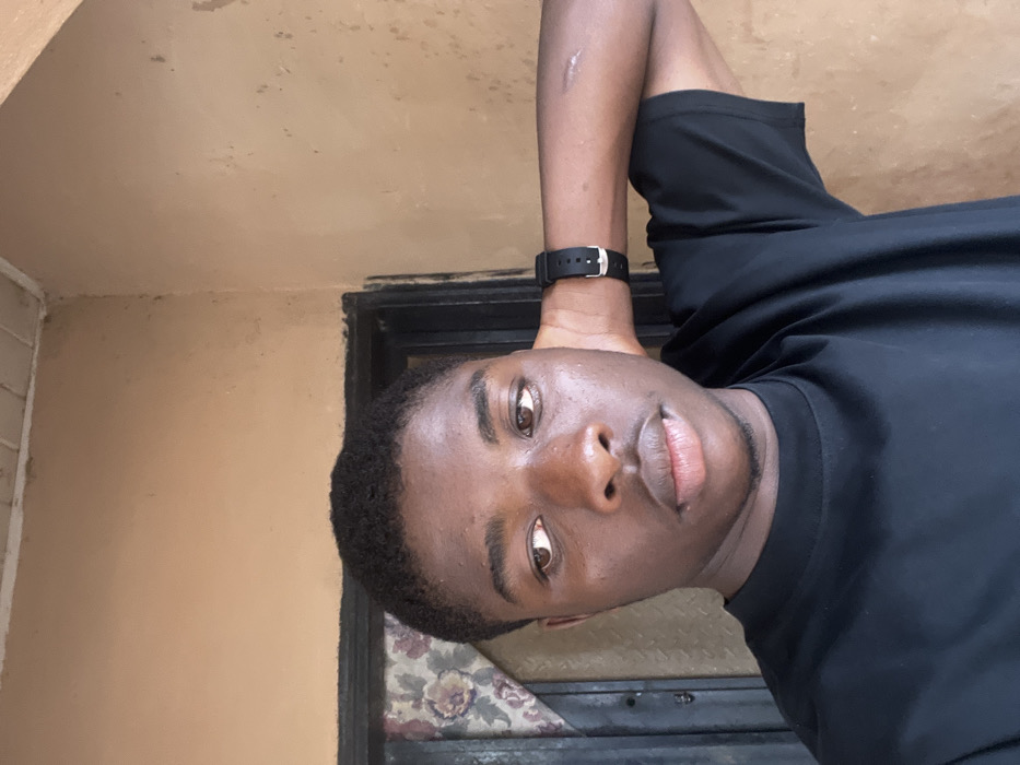 A young Black male, appearing to be in his late teens or early twenties, with short, dark, kinky hair, is depicted in a frontal, slightly off-center portrait. He is wearing a plain black short-sleeved crew-neck t-shirt. A black wristwatch with a silver buckle is present on his left wrist. His right arm is bent, with his hand placed behind his neck. His gaze is directed towards the viewer's left, with a neutral facial expression. A faint linear scar is visible on his upper left arm, above the elbow. The background consists of a textured wall painted a light brown or tan color, exhibiting signs of wear, including irregular discoloration, dirt marks, and localized peeling paint. To the subject's left, a dark-colored door frame, possibly wood or metal, is partially visible. Beyond this frame, a patterned fabric, identified as a curtain or tapestry, is present, displaying floral motifs in shades of purple, beige, and green. In the upper left quadrant of the image, a segment of a light-colored ceiling or roof soffit, possibly constructed from planks, is visible, showing areas of dark discoloration or mildew accumulation. The environment suggests an interior or sheltered outdoor space, consistent with a modest residential or commercial building. While the exact location within Kirana, Nigeria, is not visually identifiable from the image, the architectural and environmental elements are consistent with typical structures found in the region.