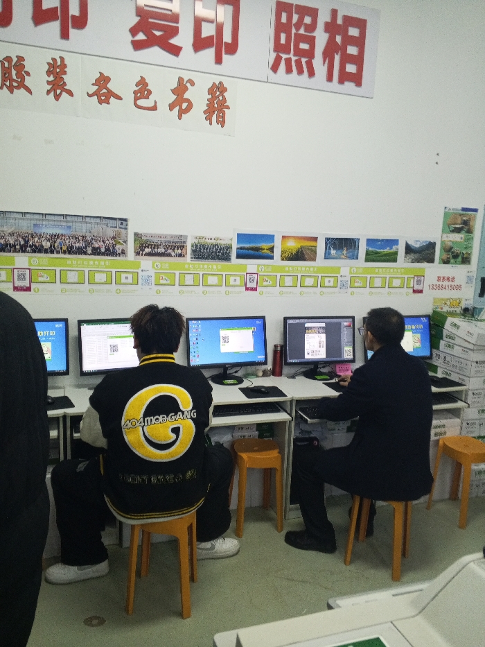 This image depicts the interior of a print and copy shop in Jiangjin, China. The scene focuses on two individuals seated at computer workstations, viewed from behind. The individual on the left wears a black and yellow varsity jacket with "404 MOB GANG" and a large "G" logo on the back, black pants, and white sneakers, and is seated on a light brown plastic stool. This person is operating a computer with a monitor displaying what appears to be a document or spreadsheet containing a QR code. The individual on the right wears a dark suit jacket, dark trousers, and black shoes, is also seated on a similar light brown plastic stool, and is engaged with a computer displaying a document or web page, also featuring a QR code. Multiple white computer monitors, keyboards, and mice are present on white desks. A red thermos is visible on the desk between the two primary subjects. Stacks of white paper in cardboard boxes are stored beneath the desks. The wall behind the workstations is white and features red Chinese characters at the top, which translate to "copy," "photo," "glue binding, various books." Below this, there are various framed images, including large group photos and smaller landscape photographs. Further down, green panels with QR codes and numbered instructions are affixed to the wall. A phone number, "13368415095," is also visible on the right side of the wall. The flooring is a light green or pale yellow linoleum. The partial view of a large white machine, likely a printer or copier, is visible in the lower right foreground.
