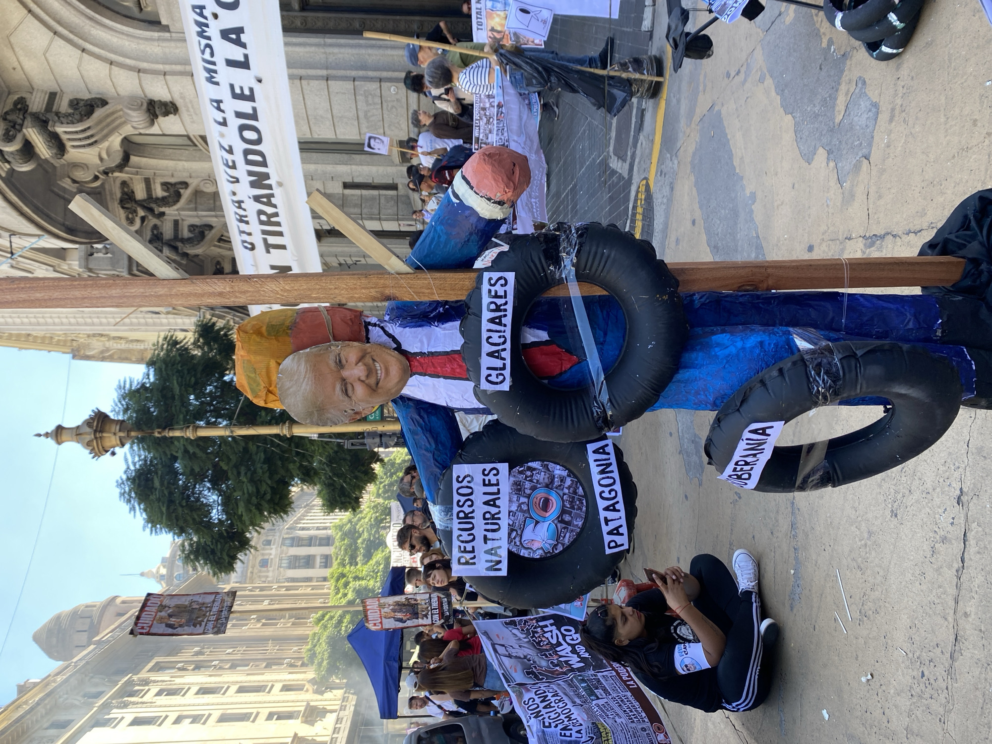 The image depicts a political protest occurring on a major avenue in the Microcentro area of Buenos Aires, Argentina, identifiable by the ornate classical revival architecture of the surrounding buildings, including a prominent domed structure in the background. The scene is outdoors under a clear blue sky. The central subject is a crudely constructed effigy resembling Donald Trump, crafted from blue and red materials with a cutout face. The effigy wears a blue suit, white shirt, and red tie. Black inflatable rings, possibly repurposed inner tubes, are attached to its body. These rings bear white labels with black Spanish text: "RECURSOS NATURALES" (Natural Resources) and "PATAGONIA" on the effigy's left, "GLACIARES" (Glaciers) on its right, and "SOBERANÍA" (Sovereignty) near its lower body. The effigy is mounted on a vertical wooden pole. Adjacent to the effigy and attached to the same pole is a blue, red, and peach-colored effigy element, cylindrical and conical, resembling a phallus or a missile. In the foreground to the left, a young woman with dark hair sits cross-legged on the paved sidewalk, engaged with a smartphone. She wears a black t-shirt, black track pants with white stripes, and white sneakers, with a white armband on her left arm. The mid-ground and background reveal a crowd of people participating in the demonstration. Banners are visible throughout the scene, displaying Spanish text. One banner on the right building facade reads "OTRA VEZ LA MISMA..." (Again the same...). Another banner to the left features text including "WALTER WALSH." A blue tent is set up on the street, and faint smoke or haze is visible in the background. The environment includes mature green trees and ornate street lamps. The ground is paved, showing some wear and discolored patches.