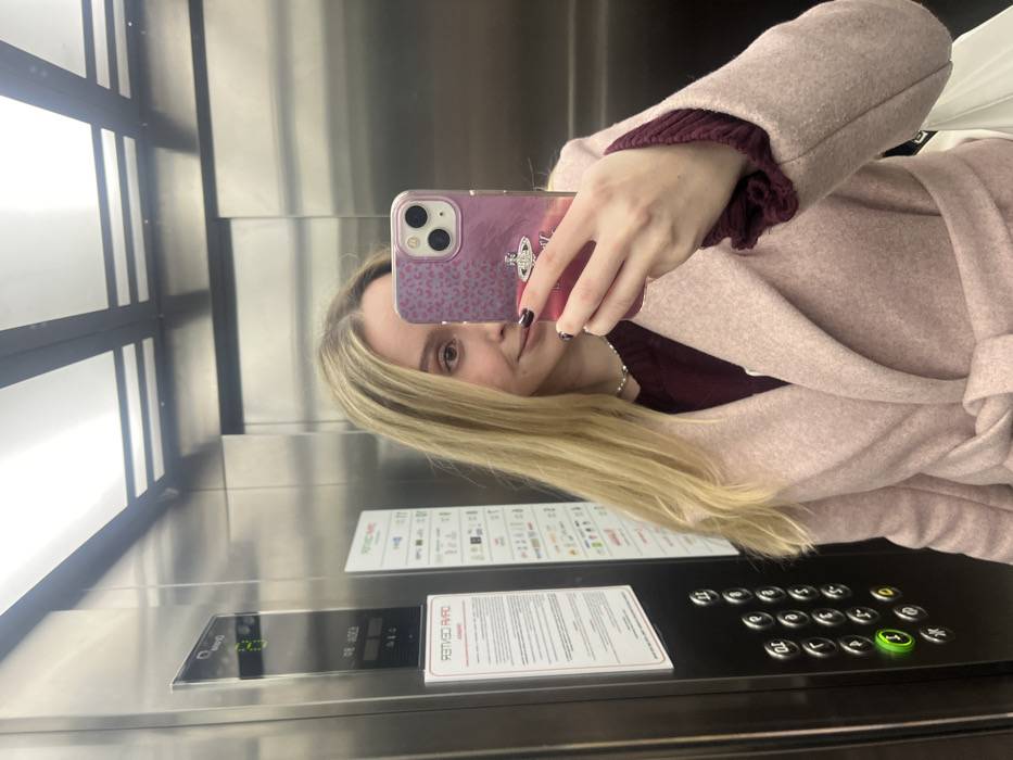 An image depicts a young adult female taking a mirror selfie inside a modern elevator