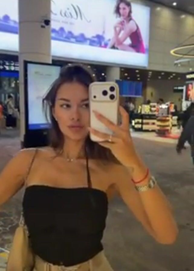 A young woman is taking a selfie in what appears to be an airport duty-free shop. She is wearing a black strapless top, beige belted pants, and a beige purse on a chain. She is holding a white iPhone in her right hand and posing in front of a mirror. Various cosmetics and perfume products are visible on the counter in front of her. In the background, there are displays for duty-free merchandise, other people walking around, and a large advertising screen featuring a model. The floor is gray and tiled.
