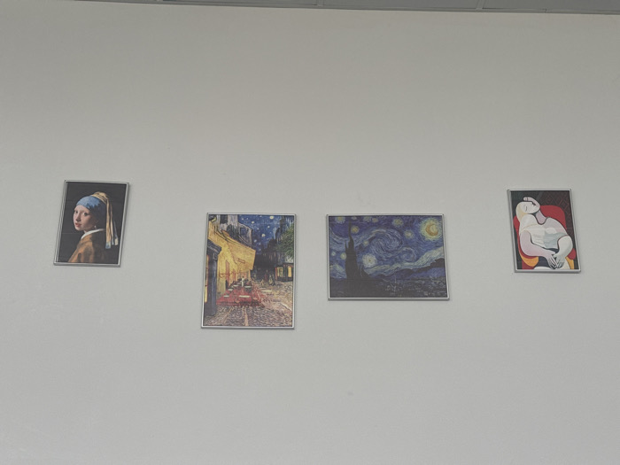 The scene displays a static interior wall in Pernik, Bulgaria, featuring four framed art prints arranged horizontally. From left to right, the prints depict: Johannes Vermeer's 'Girl with a Pearl Earring'; Vincent van Gogh's 'Café Terrace at Night'; Vincent van Gogh's 'The Starry Night'; and a reclining figure from Pablo Picasso's 'Nude, Green Leaves and Bust.' Each print is enclosed in a thin, light-colored frame. The wall is plain white, with a narrow horizontal trim visible along the top edge of the image, suggesting the ceiling junction.