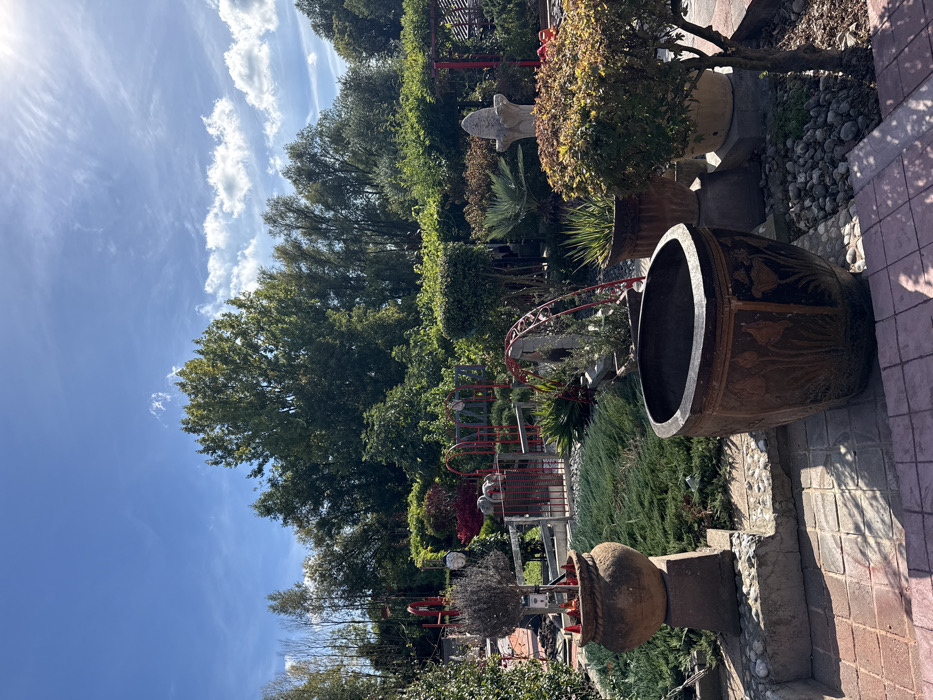 The image displays an outdoor garden or nursery setting located in Fretin, France, captured under a bright, sunny sky with scattered white clouds. The scene is devoid of human presence. In the immediate foreground, a reddish-brown paver pathway is visible. A large, dark brown, octagonal planter, adorned with bas-relief floral patterns, stands prominently in the lower center. To its left, a smaller, round, weathered terracotta pot rests on a concrete pedestal, containing a dark, dried shrub decorated with red conical objects at its base. The midground features a diverse arrangement of plants and garden decor. A low-lying bed of green, needle-like shrubs extends across this area. To the right, a small, multi-stemmed tree with reddish-brown foliage is planted in a pot. Other terracotta planters hold various green plants, including palm-like species. A sculpted stone finial, resembling a large pinecone, is positioned on a pedestal towards the right. Several red metal structures are integrated throughout the garden, including decorative arches and possibly trellises or fencing elements, some appearing to combine red and darker gray components. The ground is a mix of pebbles, gravel, and planted areas. The background is dominated by a dense canopy of mature trees and lush green foliage, forming a natural wall behind the garden display. The sky above is a clear, bright blue with distinct patches of white, cirrus-like clouds, indicating strong daylight conditions.