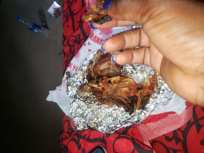 This image presents an indoor scene located in Okpanam, Nigeria, under low light conditions. In the midground, a portion of grilled or roasted meat, covered in a reddish-orange sauce and spices, is contained within crinkled aluminum foil. This foil-wrapped food rests inside a white plastic bag, partially visible with red heart patterns and faint text including "THANK" and "KYA". The entire food assembly is positioned on a red fabric surface adorned with an abstract black pattern. In the immediate foreground, a dark-skinned hand, with nails painted dark blue, holds a small piece of the meat, indicating consumption. To the far left, a smartphone with a dark screen is partially visible on the red fabric. In the blurred background, a clear plastic water bottle with a blue cap stands upright next to a small, transparent plastic bag containing several small, red, oblong items.