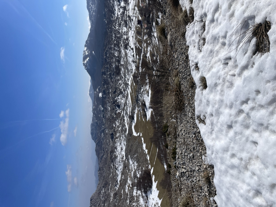 The image displays a panoramic landscape view identified as being in Kuk, Montenegro, under a clear, bright blue sky with scattered white cumulus clouds and two prominent, parallel white contrails. The foreground consists of patchy, melting snow interspersed with areas of exposed gray gravel and dry, light brown vegetation. Directly beyond, the terrain slopes downwards into a valley or plateau area. This midground features a combination of irregular rocky outcrops, dark evergreen trees, and distinct sections of brown or olive-green ground, partially covered by snow, appearing as terraced or defined fields. A winding road is visible in the middle distance on the right, leading towards a cluster of small buildings with reddish roofs, indicating a settlement. The background is dominated by a range of rugged mountains, many exhibiting dark, treed slopes and snow-capped peaks. No people, animals, or active subjects are present. The scene is illuminated by natural daylight, suggesting late winter or early spring conditions.