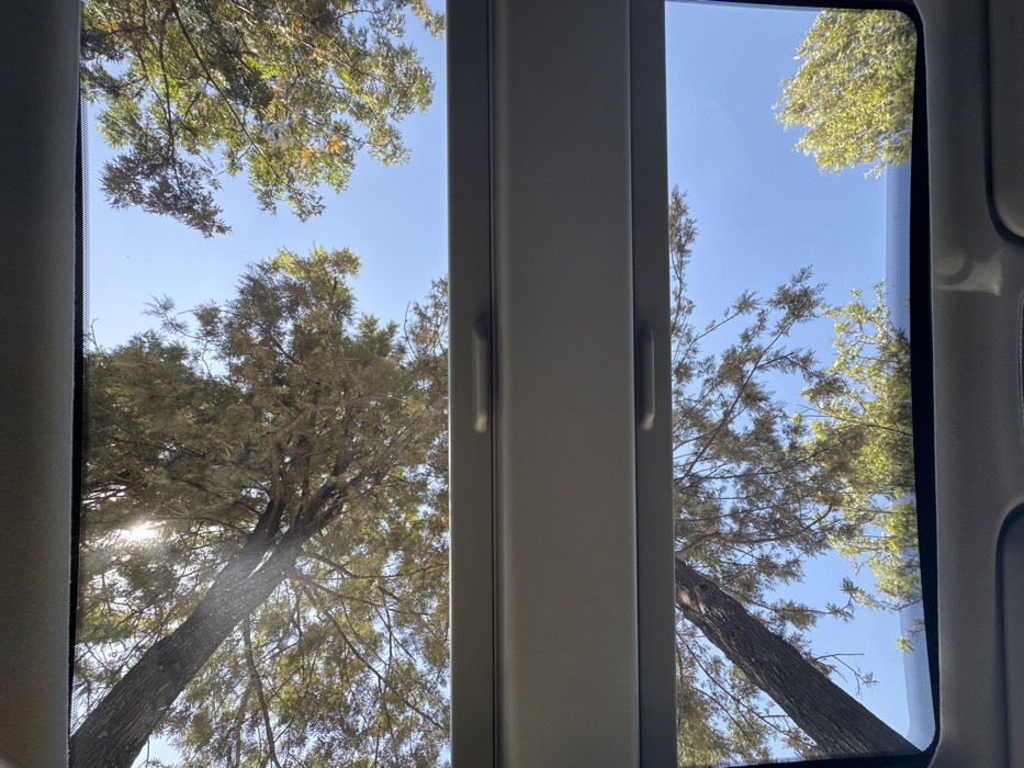 Looking out of a double window, the view is primarily of trees against a clear blue sky