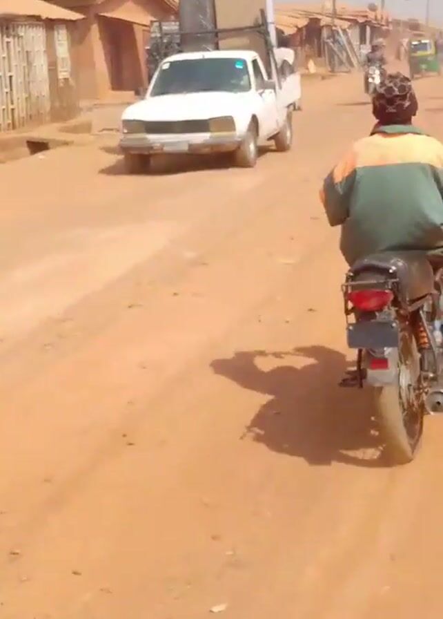 dusty, red dirt road lined with small, simple buildings, likely in a rural or developing area. A white pickup truck is driving down the road, carrying a large, bulky item (possibly furniture) in its bed. A person is riding a motorcycle behind the truck, and there are other motorcycles visible in the distance. The overall impression is of a simple, everyday scene in a less developed area, possibly a village or small town. The lighting suggests it is daytime.