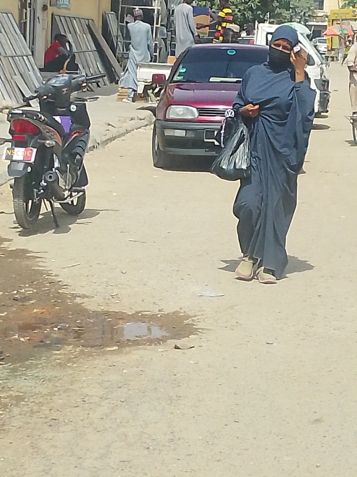 The scene depicts a daylight street in Babban Giji, Nigeria. A female subject is walking towards the viewer on the right side of the paved road, dressed in a dark blue abaya, matching hijab, and black niqab, exposing her eyes. She holds a dark plastic bag in her left hand and a crumpled white object to her left ear/face. She wears light-colored flat shoes. To her left, a black motorcycle with a visible license plate "NSCTC" is parked on its kickstand. A dark red Volkswagen Golf car is parked further down the street to the right of the motorcycle, and a white pickup truck is partially visible behind the car. In the background, multiple male subjects are present: one in light blue traditional attire near the white pickup truck, another in light grey traditional attire further left, and two individuals, one in a red shirt, seated near stacks of wooden panels leaning against a building wall. The paved road surface is light in color, with a dark liquid puddle visible on the left. The environment shows direct sunlight and sharp shadows.