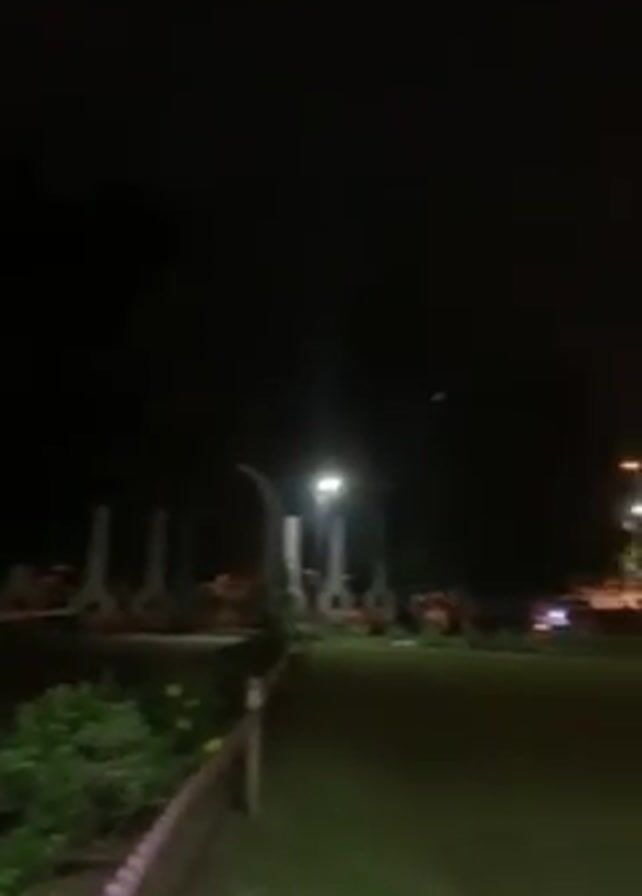 park at night. A row of white monuments is visible in the background, partially obscured by darkness. Red and white barrier tape runs along the edge of a small garden with yellow flowers. The camera pans across a grassy area where several people are gathered. Streetlights illuminate the scene, and a building is visible in the distance.