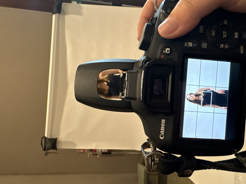 A Canon camera held by a hand is in focus, its screen displaying a woman in a black dress posing against a white background with a grid overlay