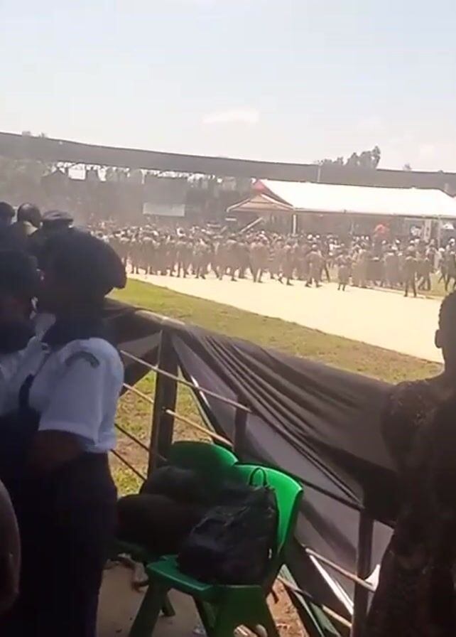 n outdoor event, possibly a military parade or celebration, taking place on a large field