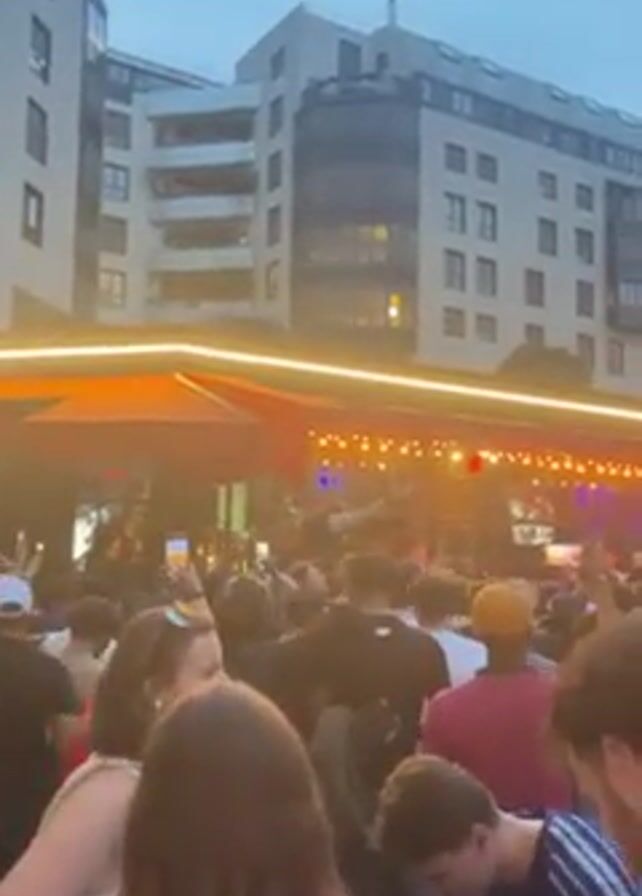 large crowd of people gathered outside, likely in an urban setting. Several buildings are visible in the background, suggesting a city or town. A large screen or display is set up, attracting the crowd's attention, possibly for a public viewing event. The crowd is dense, with individuals holding up phones, suggesting they are recording or photographing the event. Overall, the scene is festive and lively, with a strong sense of community or shared enthusiasm.