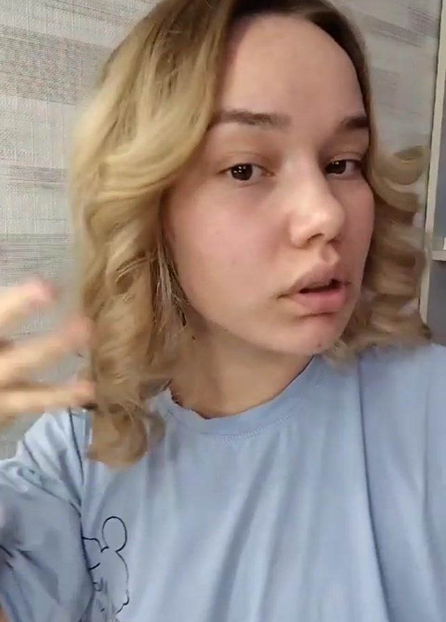 woman with light blonde, shoulder-length hair, wearing a light blue t-shirt with a Mickey Mouse design on it. She is facing the camera, touching and adjusting her hair, which is styled with soft curls. She then turns her back to the camera, displaying the full length and style of her hair. The background is a wall with a gray and white striped pattern.