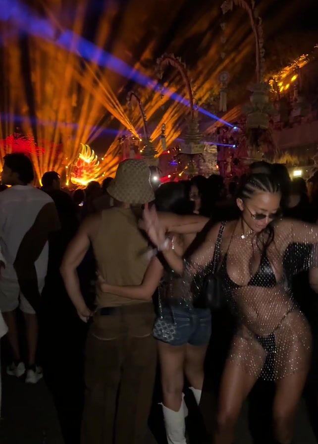 A nighttime outdoor dance party. A woman wearing a black bikini, a transparent net cover embellished with gems, and dark sunglasses dances in front of the camera. Two friends are standing behind her, one wearing a bucket hat and brown clothes, another wearing a jean skirt. There are many other partygoers around. Elaborate stage decorations are in the background, along with blue and orange spotlights.