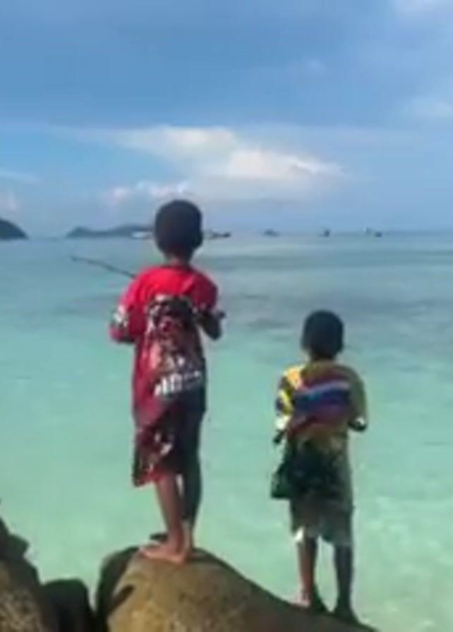 Three children are standing on some rocks on a beach, fishing. One girl is sitting and two boys are standing, each holding a fishing rod. The water is clear and turquoise. In the background, there are boats, a mountain, and a partially cloudy sky.