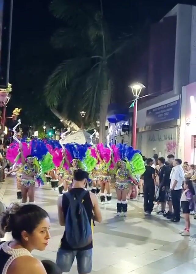 At night on a city street, a group of dancers parades in the middle of the street. The dancers are wearing colorful costumes that include large, colorful feather headdresses. Many of them are wearing roller skates. Spectators line the street, watching the dancers. A large palm tree is partially visible between the spectators and the dancers. Street lights illuminate the scene.