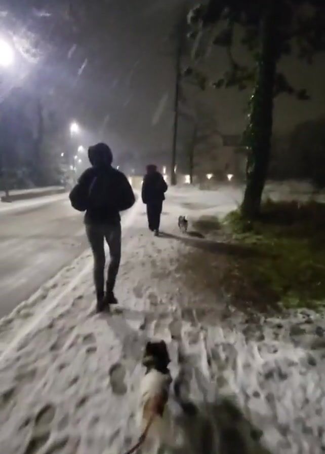 Two people walk along a snowy sidewalk at night, each with a dog on a leash. Streetlights illuminate the scene. Snow is falling heavily. The sidewalk is covered in fresh snow with many footprints. A road runs parallel to the sidewalk. On the right, trees and vegetation are visible, also covered in snow. The figures are silhouetted against the light. One figure is wearing a dark jacket and light-colored pants. The other is further ahead, wearing darker clothing and a red hat or hood.