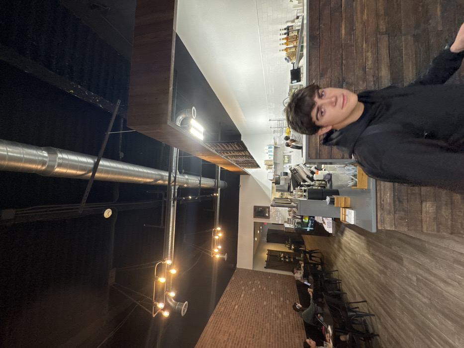 The image depicts the interior of Zen Cafe, a coffee shop located in South Bend, Indiana, United States. A young male with dark hair, wearing a black hooded sweatshirt and backpack, is positioned in the right foreground, looking towards the camera. The establishment features a black ceiling with exposed silver HVAC ductwork and electrical conduits. An exposed red brick wall runs along the left, illuminated by warm-toned, multi-bulb industrial pendant lights. The floor is light-colored wooden laminate. In the left midground, a customer seating area with dark tables and chairs is occupied by three individuals, primarily engaged with laptops. To the right, a service counter with a dark grey surface and wooden plank facade displays coffee equipment, various bottles, and supplies. Behind this counter, against a white subway tile wall, two employees are visible. Dark wooden menu boards are mounted overhead above the counter.