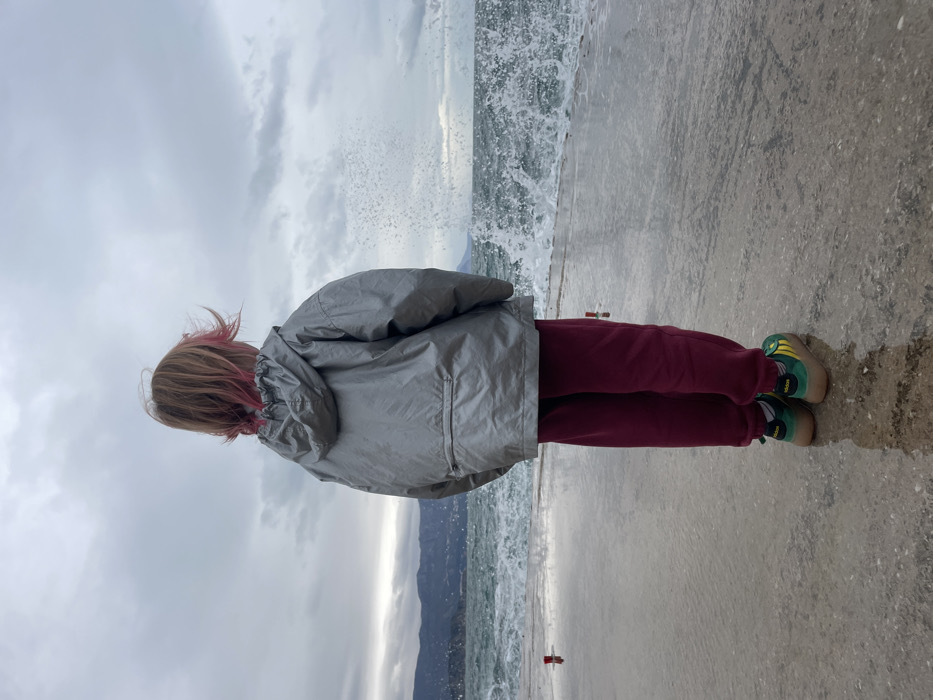 The image captures a single individual, viewed from the back, standing on a wet, grey concrete platform at the edge of a body of water in Prijevor, Montenegro. The individual, identified as a child, has long, light brown hair with distinct pink highlights at the tips, slightly uplifted by wind. They are dressed in a metallic grey hooded jacket, dark red sweatpants, and green and yellow athletic shoes with visible "Adidas" branding on the heels. The individual faces the sea, which features active, breaking waves generating substantial spray, particularly to the right of the subject. Two red cylindrical fixtures are present on the concrete platform to the left, and a smaller red and white object lies near the individual's right foot. The sky is overcast with multiple layers of grey clouds. Distant mountains or hills are visible on the horizon line across the water.