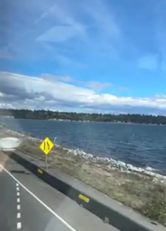 view from a moving vehicle. The camera is pointed towards a body of water, likely a bay or a sound, with a tree-lined shore in the distance. The sky is blue with some puffy clouds. A road runs alongside the water, separated by a concrete barrier. There are road signs visible. The video appears to be taken during the daytime.