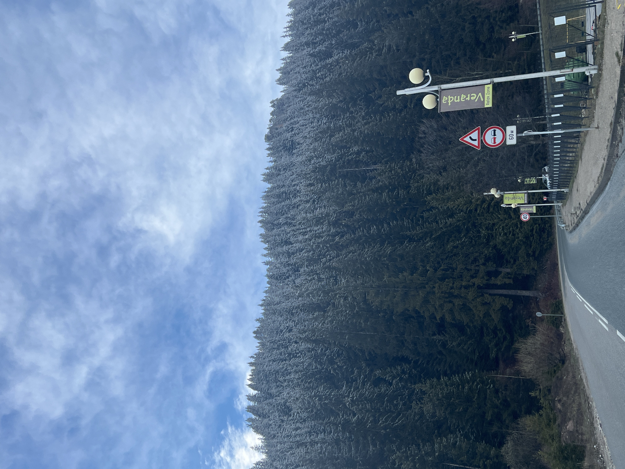The image depicts a roadside scene near Smolyan, Bulgaria. A dense evergreen forest rises to the right, partially covered in frost or light snow. A road runs along the base of the forest. Along the road are street lamps and multiple signposts, some displaying the word "Veranda". Traffic signs are also visible, indicating a curve and speed limits. The sky is partly cloudy with blue patches.