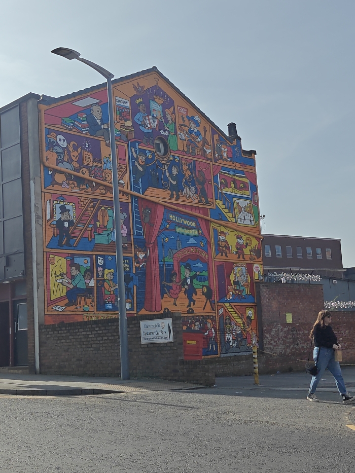 - "The image depicts a vibrant, multi-story mural on the gable end of a building in Stockport, United Kingdom, under a clear, bright blue sky" by FM-21ApN2, licensed under CC BY 4.0